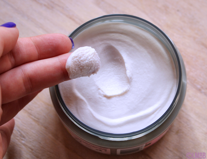 A testradír teljesen olyan, mint a Dove viszonylag új testradírjai, nagyon finom, krémes, aprócska radírozó őrleménnyel (nem tudtam rájönni, hogy pontosan mi az), ami pont megfelelő arányban van jelen, szerencsére nem túl kevés, így érezhető a hatása. A bőrön nem hagy olajos réteget, ezt nagyon rühellem, úgyhogy mindenképpen áldásos számomra ez a tulajdonsága. Könnyen felvihető és eloszlatható a bőrön, hála a formulának és ugyanolyan könnyen le is mosható.